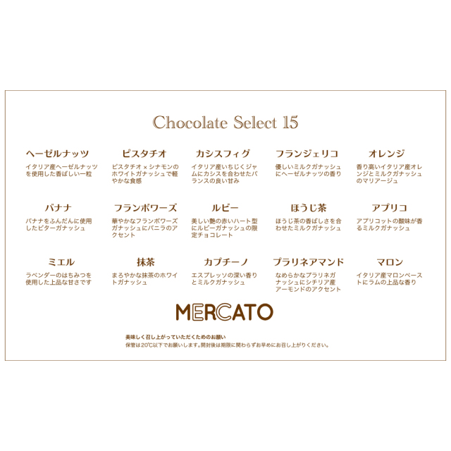 ラインナップは、「ピスタチオ」「オレンジ」「バナナ」「マロン」「抹茶」「ほうじ茶」「カプチーノ」のダークタイプ7種。「ヘーゼルナッツ」「フランジェリコ」「アプリコ」「ミエル」「プラリネアマンド」のミルクタイプ5種。そして「カシスフィグ」「フランボワーズ」とハート形の「ルビー」のホワイトタイプ3種の計15種。色々な味わいを一度に楽しめる、贅沢な詰め合わせになっています。